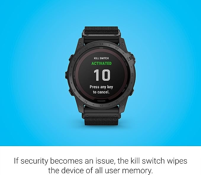 Specialized tactical features include Jumpmaster Mode, Waypoint Projection, Stealth Mode, Dual Position Format, Preloaded Tactical Activity, and a Kill Switch to erase user data and positions