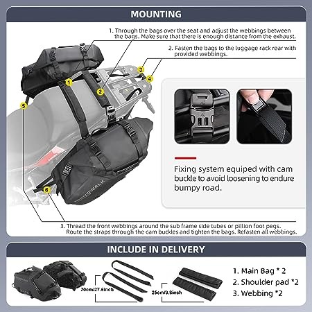 • Estructura: Las alforjas grandes con dos bolsas laterales de 24L (L49 "* W20"* H25 "/cada uno); 2 hombreras (longitud 9.8 "/ cada uno); 2 correas (longitud27.6 "/ cada uno). La impresión reflectante del logotipo promete tu conducción segura por la noche.