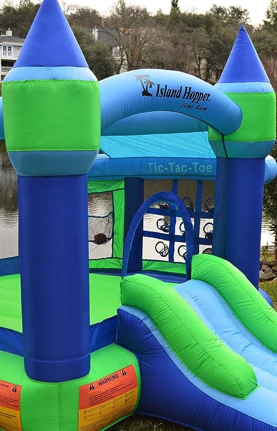 Island Hopper Shady Playhouse with Shaded Canopy - Recreational Children's Bounce House with Padded Floor Side Room, Basketball, Target Throw, tic-tac-toe