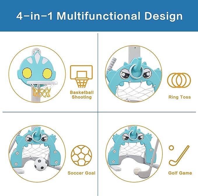 Kids Basketball Rim Set 4 in 1 Sports Activity Center Easy Score Soccer Goal Ring Height Adjustable
