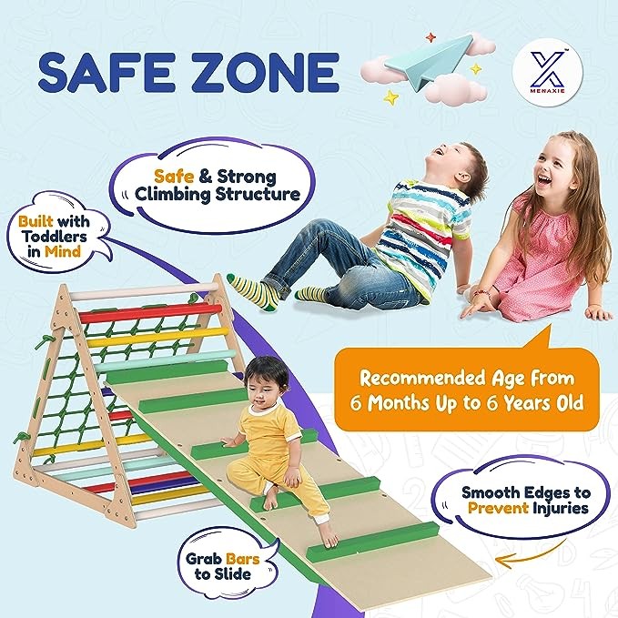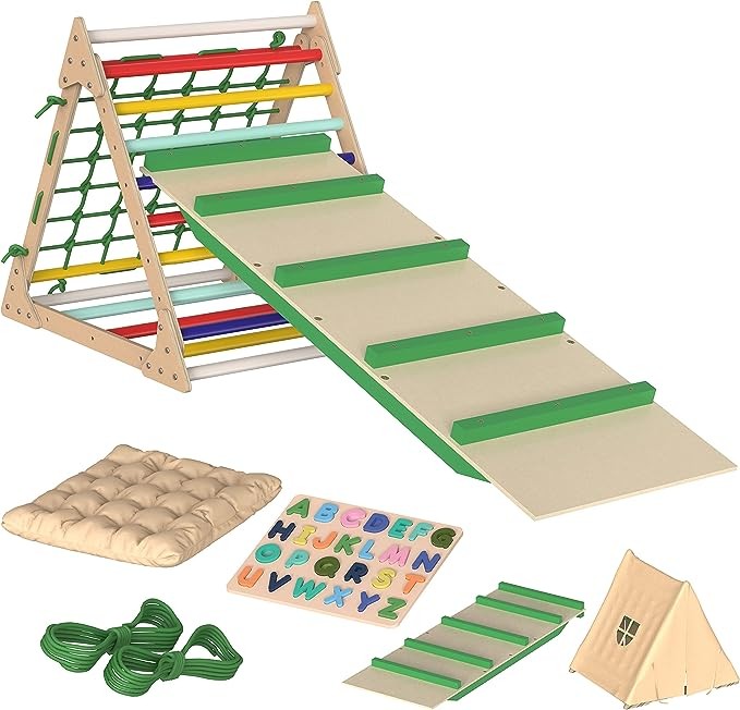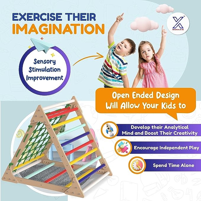 MENAXIE 31.2" X 28.3" X 27.75" Pikler Triangle Mountaineer with Ramp, 2 Wooden Pieces, Children's Exercise Equipment, Includes Coarse Alphabet Puzzle, Cotton Mesh and Adjustable Cushions