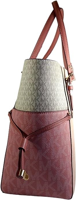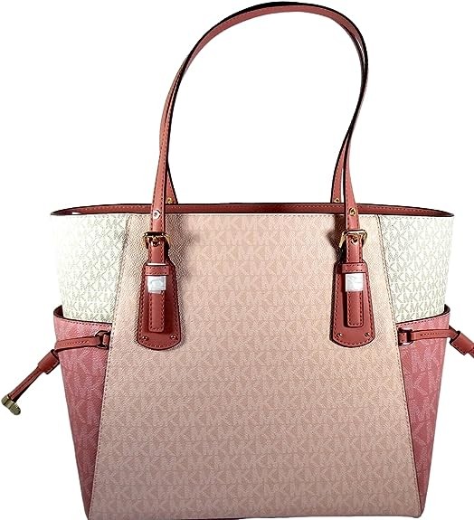 • The MICHAEL Michael Kors Voyager East/West Tote features a leather exterior, dual flat top shoulder straps, side exterior slip pockets, and brand name hardware at the front.