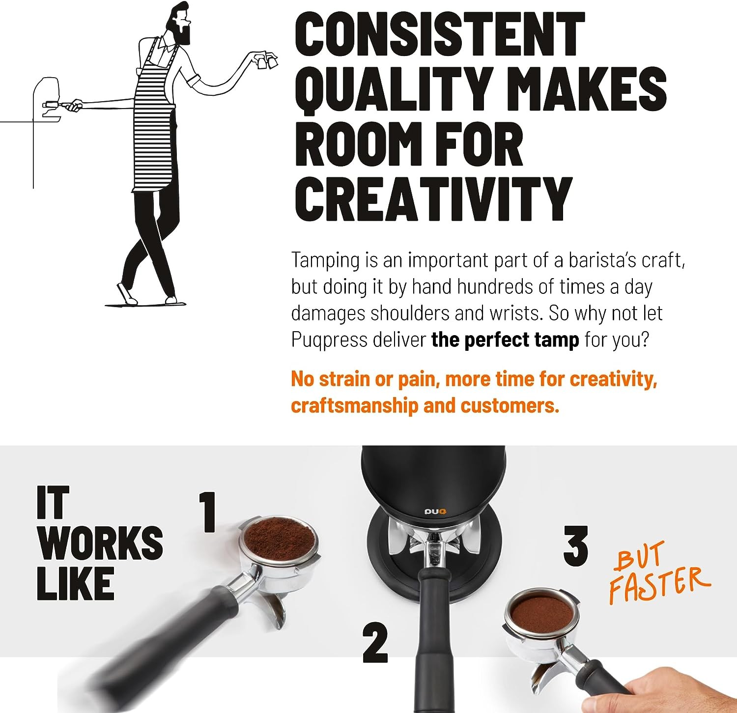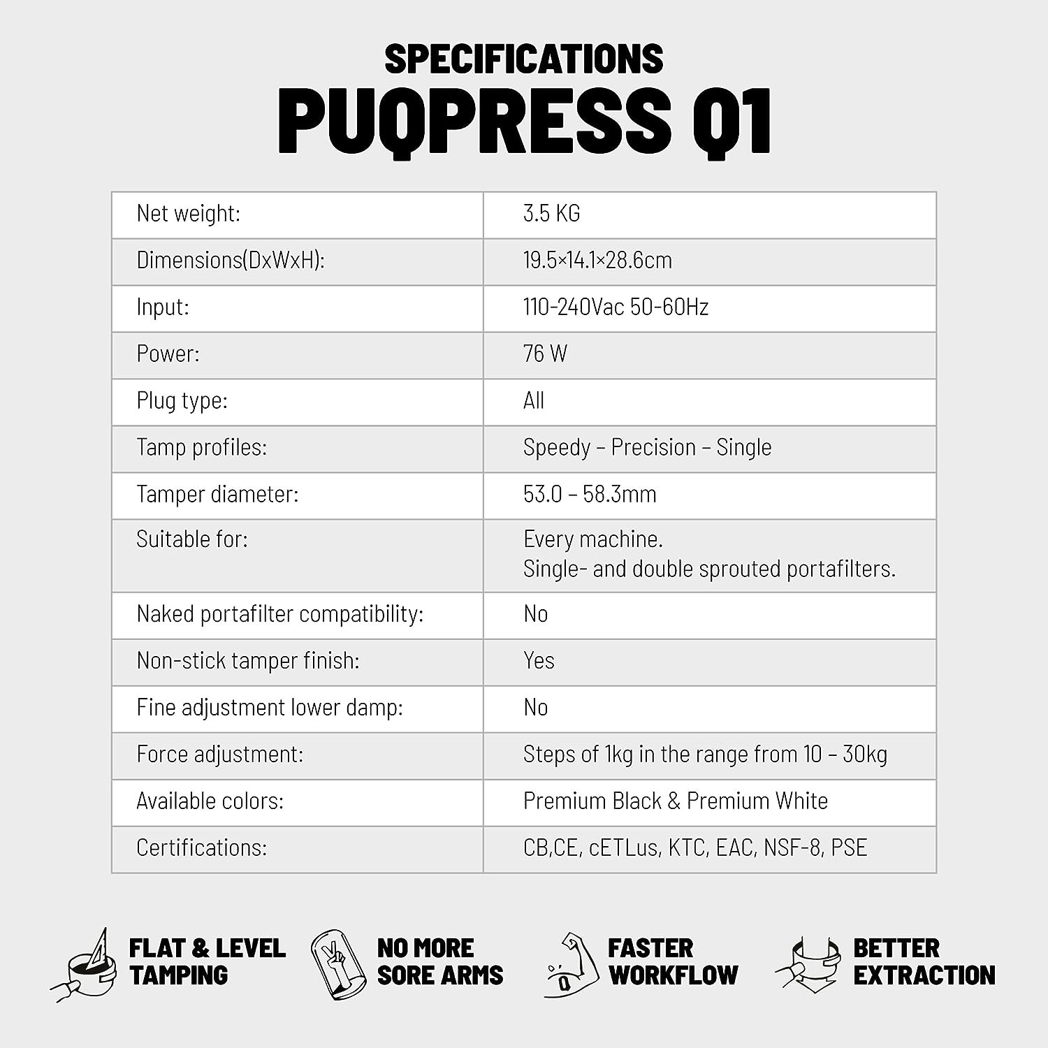 • SAVE YOUR ARMS FROM STRAIN & PAIN. Tamping is a crucial part of every barista’s craft, but hand-tamping hundreds of times per day wreaks havoc on the hands, wrists and shoulders. Now you can offload the hard work to PUQPress Q1 and enjoy a perfect tamp every time without straining your body.