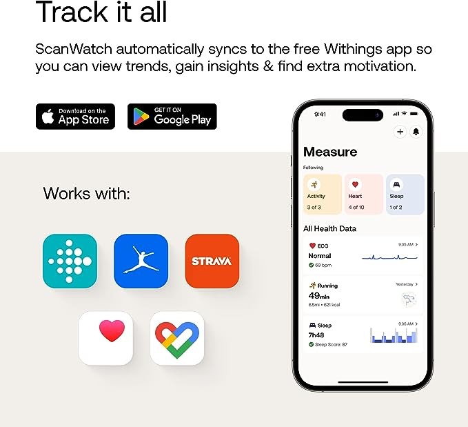 Automatic Data Synchronization - ScanWatch syncs seamlessly with the free Health Mate app via Bluetooth. Works with Alexa, Apple Health, Google Fit, Strava and over 100 top health and fitness apps.