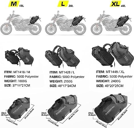 • Estructura: Las alforjas grandes con dos bolsas laterales de 24L (L49 "* W20"* H25 "/cada uno); 2 hombreras (longitud 9.8 "/ cada uno); 2 correas (longitud27.6 "/ cada uno). La impresión reflectante del logotipo promete tu conducción segura por la noche.