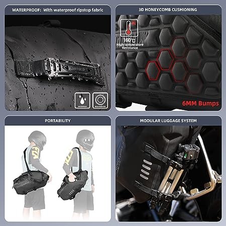 • Material impermeable y resistente al desgarro: esta bolsa impermeable para motocicleta está hecha de material de lona de PVC 500D. El PVC de alta densidad es resistente al polvo, al desgaste y fácil de limpiar. Como bolsa resistente al desgarro por su elemento de tela antidesgarros, puedes llevar muchos artículos.