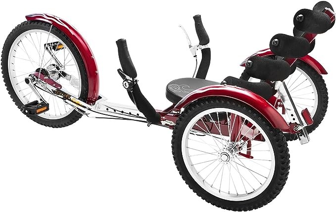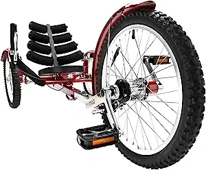 A 3-wheeled bicycle for women and men who want a little exercise and fun outside. This recumbent three-wheel bicycle is great for exercise, leisure rides, a quick trip to the market, or even walking the dog. Equipped with a reverse gear, backing up in a snap! Trike recumbent bikes are more comfortable and let you ride and exercise longer. Ergonomic recumbent seat provides evenly cushioned back support. A three-wheeled cruiser bike for women and men who prefer a more comfortable ride than a standard upright bicycle. A tricycle recumbent is an excellent way to keep fit and enjoy the outdoors. Increase your daily calorie burn and get a cardiovascular workout with minimal stress on your knees, back and joints. Features adjustable frame that makes riding this 3-wheel bicycle comfortable and easy for the whole family. Suitable for riders 4 feet Tall to 6 feet 3 inches Tall and weighing up to 250 lbs. Almost anyone can ride this adult pedal trike! Ride with confidence! Low center of gravity on this three-wheel cruiser provides unprecedented stability. No balance required. Dual-joystick steering offers smooth maneuverability with simple hand movements. Durable heavy duty recumbent three-wheeled bicycle frame is constructed of hi-ten steel. This tricycle cruiser features chainless design, caliper handbrakes, 20 inch front wheel with free-wheel hub, 16 inch rear wheels, inflatable rubber tires and a safety flag. Dimensions: 28 x 25. 6 x 48 inches (62 inches extended). weight 44 lbs. A 3-wheel bike for women, men, teens and kids ages 10 and up. Some assembly required.