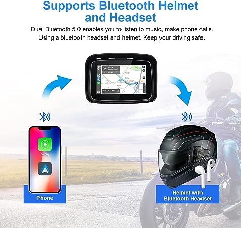 【Built-in Dual Bluetooth】Portable Apple Carplay with Built-in Dual Bluetooth, pair your phone to the carplay touch screen via Bluetooth, pair the unit to your Bluetooth helmet/earphone, then you can adjust the volume/switch songs and make hands-free calls by your helmet or earphone.